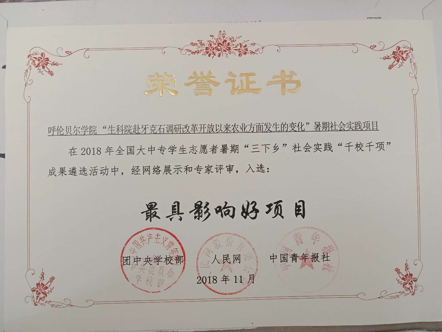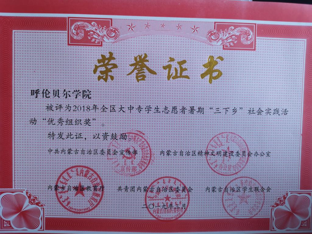 此外,去年11月,在团中央学校部、全国学联秘书处下发的《关于2018年全国大中专学生志愿者暑期“三下乡”社会实践活动的通报》中,永利yl23411集团官网团委荣获全国“三下乡”社会实践活动“优秀单位”称号(全区6个),“生科院赴牙克石调研改革开放以来农业方面发生的变化”实践团队获“最具影响好项目”称号。