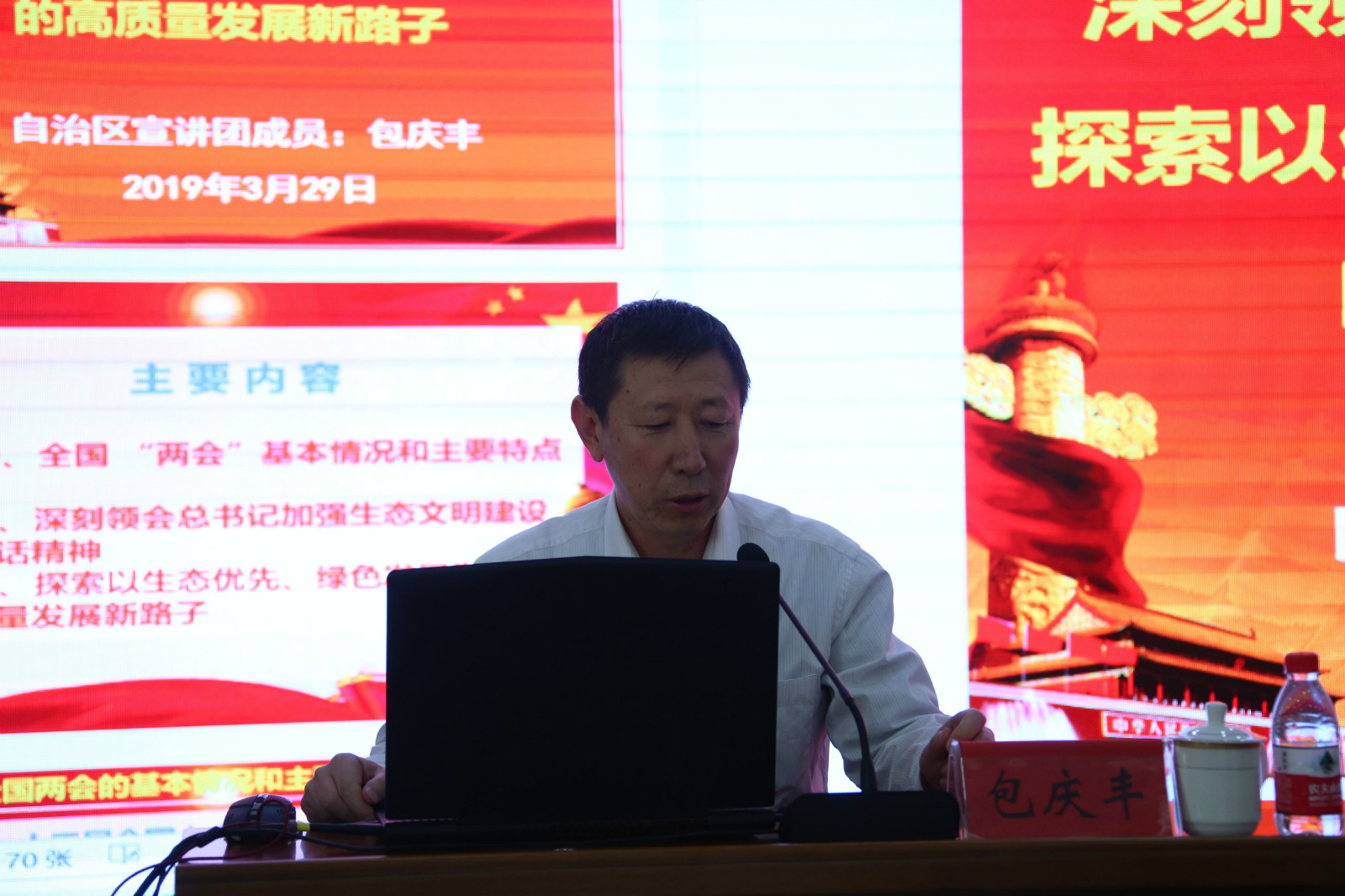 3月29日下午,在崇文楼A座201会议室,永利yl23411集团官网举办了2019年首场形势政策报告会。特邀内蒙古农业大学马克思主义学院院长、博士生导师包庆丰教授做主题为“深刻领会总书记重要讲话精神,探索以生态优先、绿色发展为导向的高质量发展新路子” 的专题报告。呼伦贝尔市委宣传部副部长刘立东,校党委副书记张国栋,党委委员、副校长乌云达来、副校长孟祥宏、纪检委书记岳勇等在家的校领导、校党委理论学习中心组成员、机关党委党员干部、学生代表参加了报告会。报告会由校党委委员、宣传部部长刘秀兰主持。