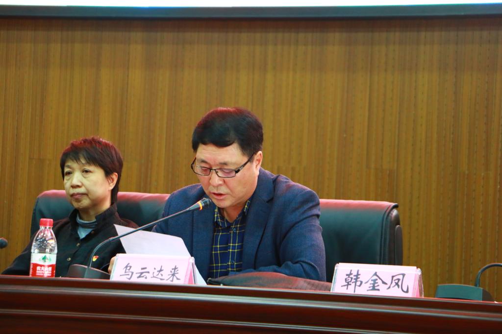 启动仪式上,学工处处长李健宣读了本届宿舍文化节活动方案。此次宿舍文化节共五个模块10个小项活动。既有传统活动“宿舍风采”、“最美年度宿舍长”、“优良学风宿舍”评选等宿舍风采展示,又有“智者交流”—校园象棋大赛、“品味书香”读书分享会等文化活动;既有“舞动青春、活力飞扬”啦啦操大赛及宿舍文化节系列等文体活动,又有心理健康教育进宿舍等关爱学生身心健康的活动,还有平安校园系列活动及宿舍文化节文艺演出。传媒学院辅导员张晶老师,教育科学学院学生郭美丽代表全校师生进行了发言。乌云达来副校长强调:要坚持德育为先,五育并举、全面发展的格局,重视学生综合素质培养,克服片面追求某一或某几方面教育的现象。努力构建德智体美劳全面培养的教育体系,形成更高水平的人才培养体系。要求各学院不仅要注重宿舍文化节举办的结果,更要注重举办的过程,做到集合所有的教育资源,整合一切可以整合的力量,上下联动,强化落实,在历时一个月的活动时间里取得预期的教育效果,达到预期教育目的。希望同学们规范自身文明行为,树立集体荣誉感,以良好的舍风促进学风建设,争做文明大学生。