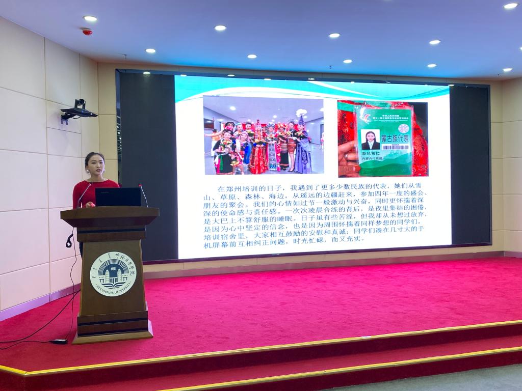 新哈布拉同学与大家分享了她作为蒙古族代表参加第十一届全国少数民族传统体育运动会的和国庆七十周年阅兵式和群众游行的故事。她怀揣着深深的使命感与责任感,用行动诠释了呼院志愿者的精神、责任与担当。尽管在训练期间烈日当空,蚊虫相伴,熬夜、通宵彩排都是家常便饭,嗓子喊哑了,胳膊挥舞酸了,双腿蹦疼了,额头出现红肿,后背湿透了,她也依然在微笑坚持,从未有过一句抱怨。她是草原上的一朵小花,在瘦弱的身体中充满着巨大的能量!向全国展现了内蒙古人民吃苦耐劳、一往无前的蒙古马精神!