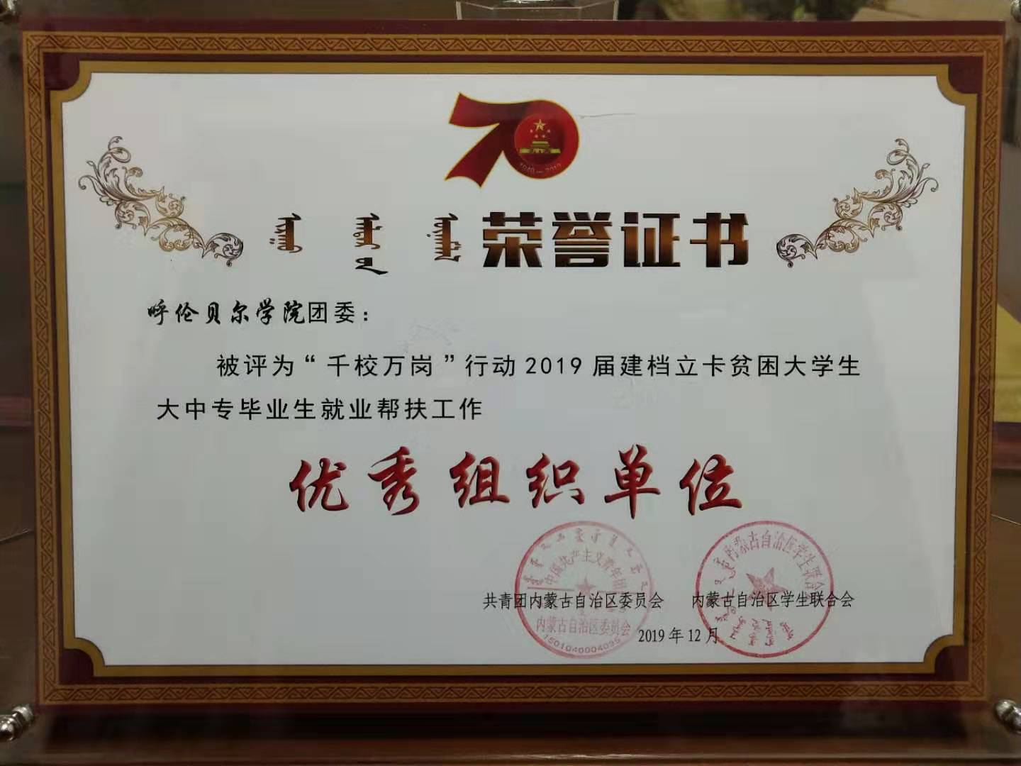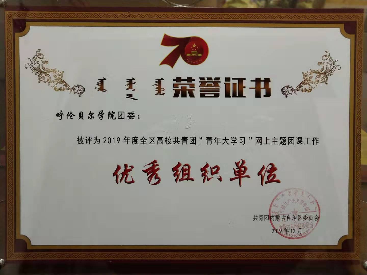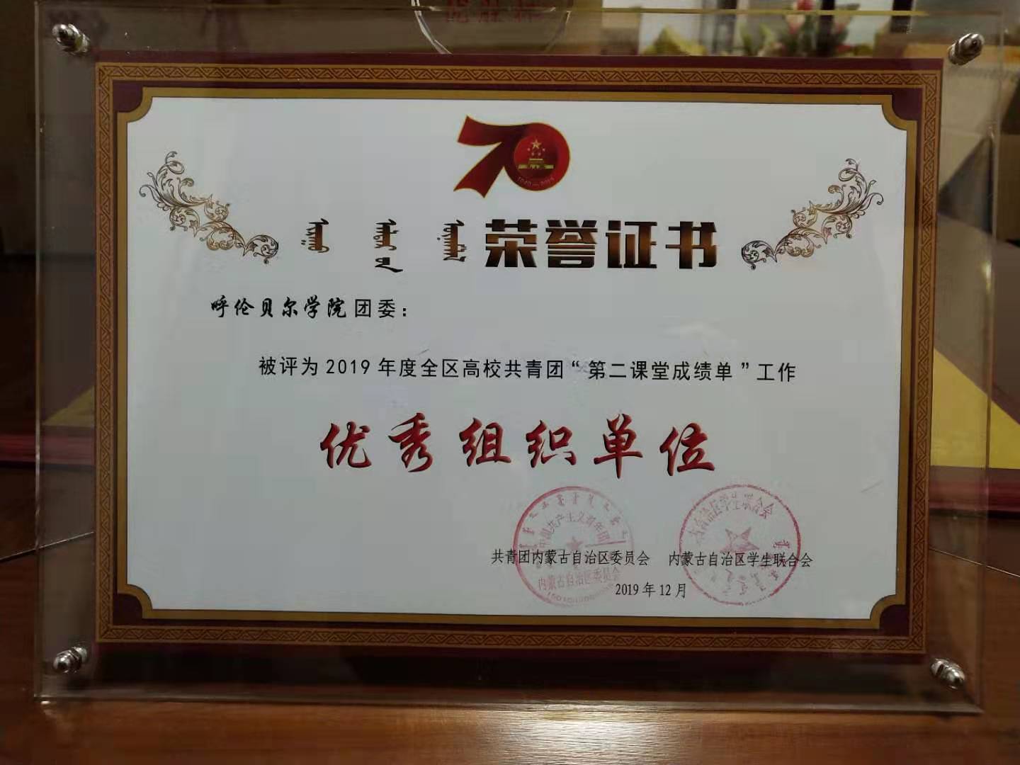 12月29日在内蒙古大学举行的“2019年全区高校团委书记团建述职评议会及颁奖典礼”上永利yl23411集团官网团委获得了全部五项表彰。分别为2019年度全区高校共青团“青年大学习”网上主题团课工作优秀组织单位、“千校万岗”行动2019建档立卡贫困大学生大中专毕业生就业帮扶工作优秀组织单位、2019年度全区高校共青团“第二课堂成绩单”工作优秀组织单位、第十一届“挑战杯”全区大学生课外学术科技作品竞赛优胜杯、全区青年马克思主义者培养工程研究培训示范基地等。