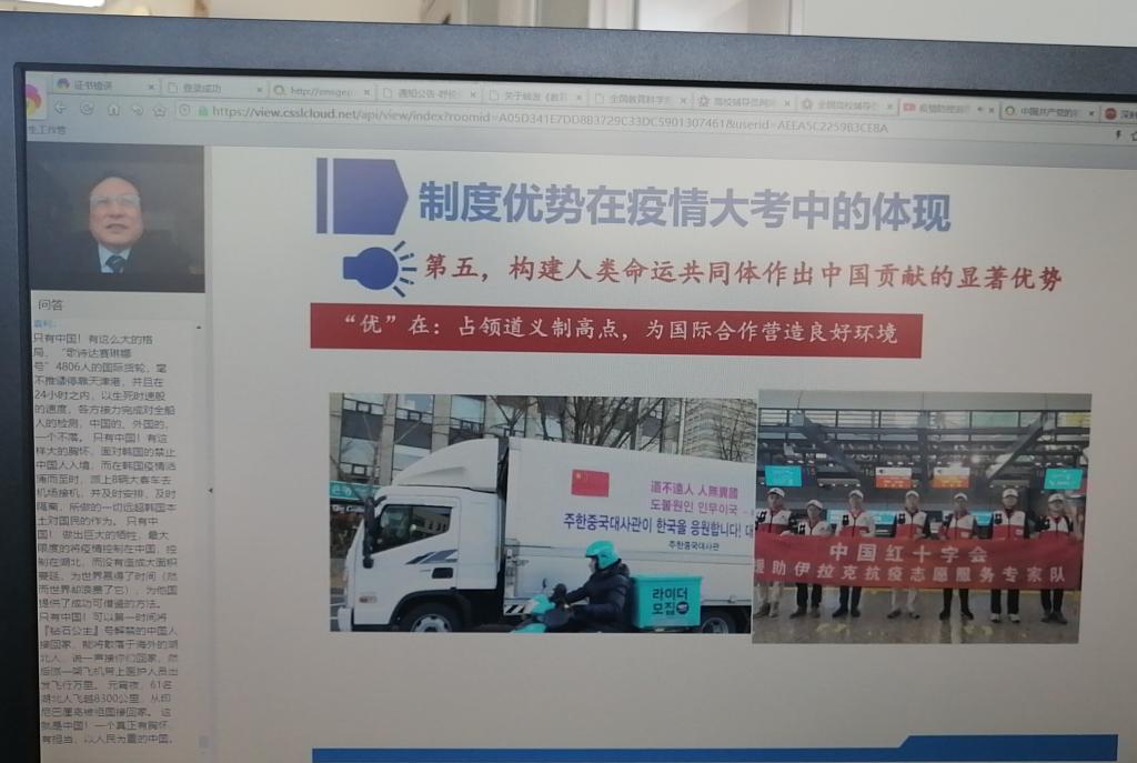 3月28日上午,专职辅导员们参加了第一次网络直播学习活动,西安交通大学马克思主义学院卢黎歌教授以《疫情防控治理效能与中国制度优势》为题帮助辅导员全面了解防控形势和应对策略,深入感受中国特色社会主义制度的优越性和国家治理能力效能的优势,让辅导员在未来疫情防控中有底气、有信心开展好本职工作,直播课还邀请刘铁、任雅才、王银思、袁利、朱丹等历年全国辅导员年度人物在线答疑,分享交流疫情防控经验,辅导员们深受启发,希望有更多机会交流。