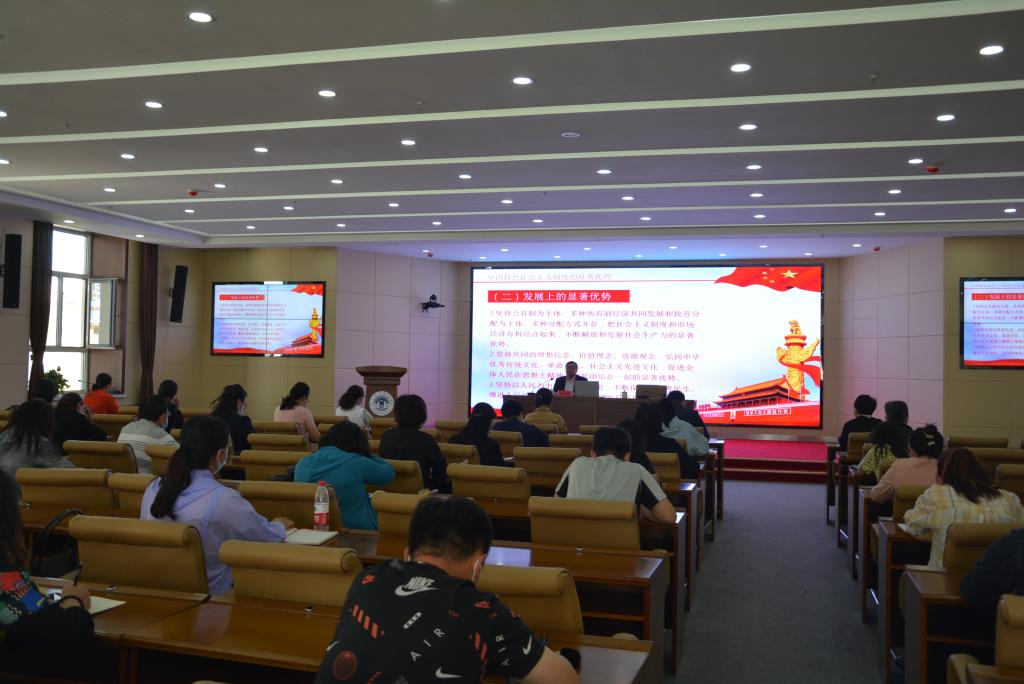 张国栋副书记以“坚定制度自信,弘扬抗疫精神,凝聚奋进力量”为主题,从学习贯彻十九届四中全会精神出发,结合抗疫新冠疫情工作和本年度党建工作重点任务,从“中国特色社会主义制度的显著优势”、“探索高校中国特色社会主义制度优势教育的路径”、“从抗疫精神看党的领导制度优势”、“结合学校基层党建工作,加强基层党组织建设”四个方面进行了系统讲述。透过疫情防控工作,充分彰显了中国特色社会主义制度无与伦比的优越性,中国特色社会主义制度优势和治理效能在抗疫中发挥了决定性作用;要牢牢把握高校思想政治教育的主渠道,加强课程思政建设,积极将中国特色社会主义制度优势教育融入到课程教学中;强化党的领导,进一步发挥学院党总支的政治核心作用,全面提高党建工作水平,充分发挥支部的战斗堡垒作用和党员的先锋模范作用。党课主题鲜明、内容丰富、蕴含深刻,具有很强的针对性和指导性,大家接受了一次制度自信教育和深刻的党性教育,更加坚定了中国特色社会主义制度自信,激发出了担当作为的强大动力和奋进激情。