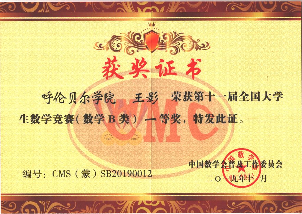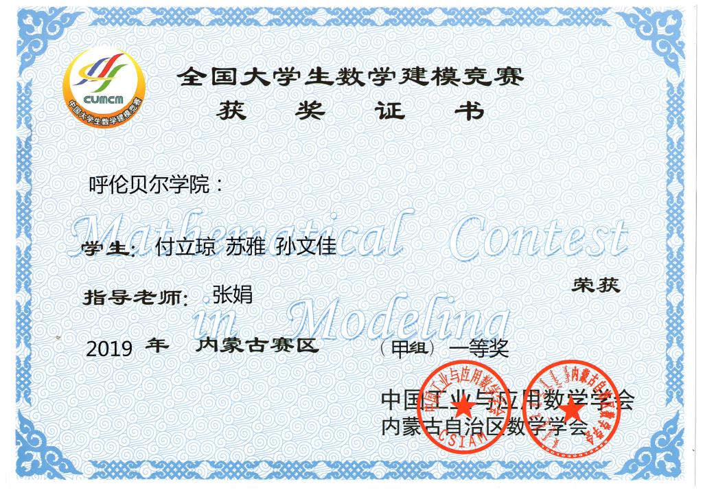 近日,2019年全国大学生数学竞赛和数学建模竞赛结果相继揭晓,永利yl23411集团官网数学与统计学院学子在两大竞赛中再创佳绩,在全国大学生数学竞赛中有1人获得内蒙古赛区一等奖,8人获得内蒙古赛区二等奖、8人获得内蒙古赛区三等奖,在全国大学生数学建模竞赛中有3人获得内蒙古赛区一等奖,3人获得内蒙古赛区三等奖。