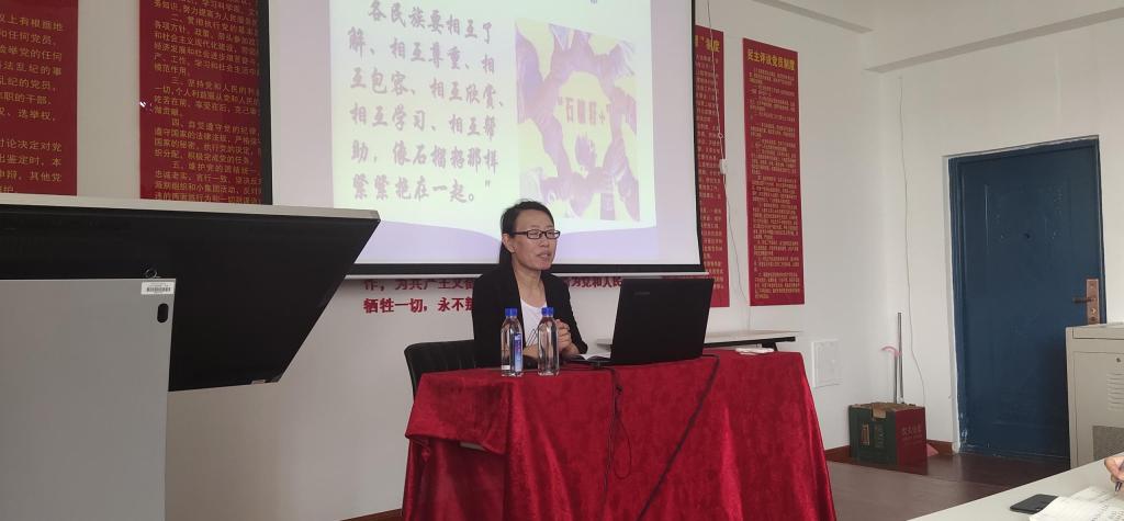 马克思主义学院讲师程欣以广阔的政治视野和深厚的理论功底围绕“习近平新时代民族团结思想”这一主题,从习近平新时代民族团结思想的背景、实践基础、主要内容及“五个认同”、制度的优势五个方面进行了深入浅出的解读,为大家进一步做好民族团结进步教育工作开拓了思路、提供了指导。