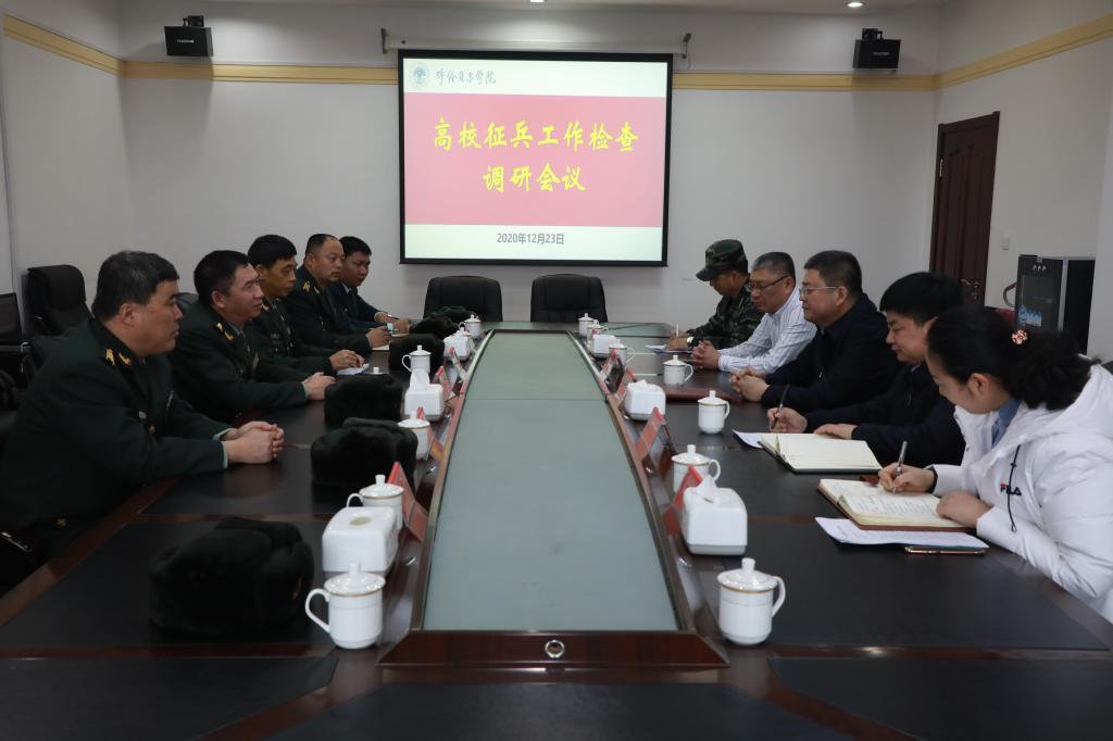 12月23日,市征兵工作领导小组常务副组长、军分区张晓春司令员率工作组,深入永利yl23411集团官网开展大学生征兵工作检查调研。市征兵办副主任、军分区动员处张树宏处长,海拉尔区委常委、区人武部高树法政委、乔海滨部长陪同调研。学校党委副书记、校长王曙光,党委委员、副校长闫立志及相关处室工作人员参加了调研座谈会。
