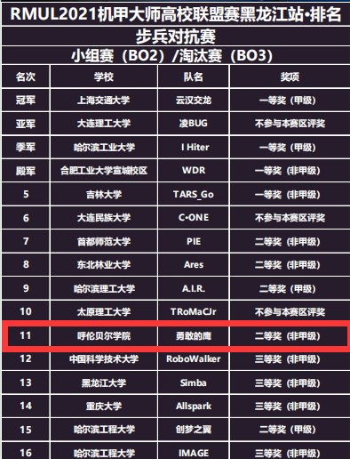 3月26日至28日,由共青团中央举办的第二十届全国大学生机器人大赛RoboMaster2021机甲大师高校联盟赛(黑龙江站)在哈尔滨工程大学热烈开幕。本次比赛吸引了上海交通大学、重庆大学、哈尔滨工业大学、东北林业大学等来自全国多省的16所高校30余支队伍,近300名学生参赛。永利yl23411集团官网代表队——“勇敢的鹰”战队获得步兵对抗项目非甲级参赛队二等奖的好成绩。