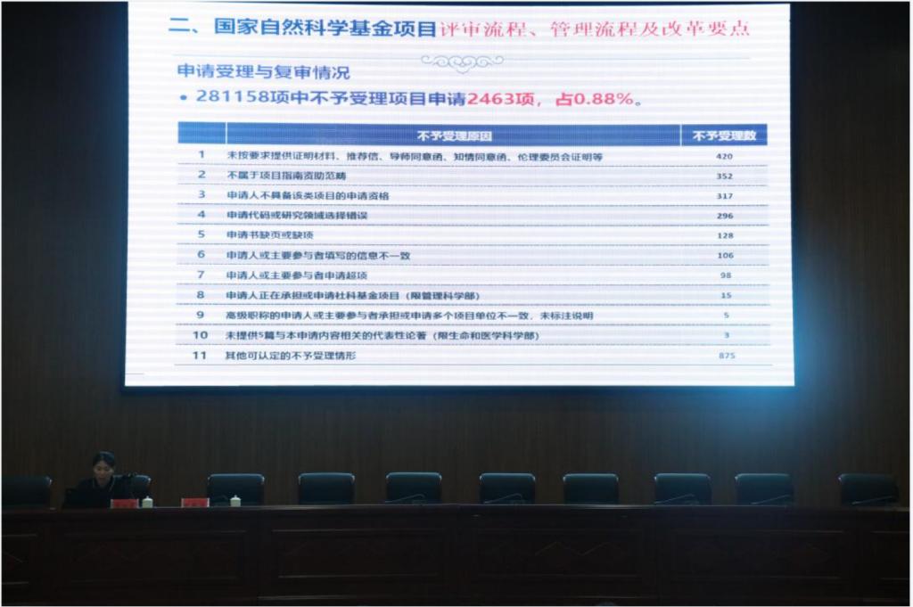 在自科专场上,张桂芝副处长就国家自然科学基金项目类型、申请与资助概况、评审流程、管理流程及改革要点进行了讲解。结合永利yl23411集团官网与兄弟院校立项情况,张桂芝副处长提出了申报注意事项。