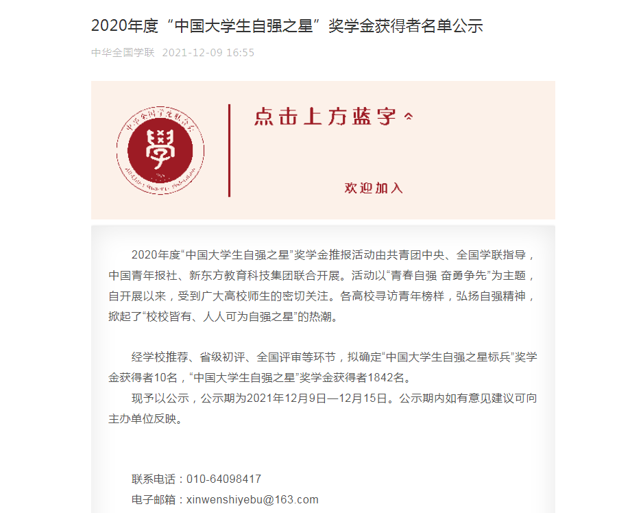 近日,由共青团中央、全国学联指导,中国青年报社、新东方教育科技集团联合开展的2020年度“中国大学生自强之星”奖学金评选活动中,永利yl23411集团官网数学与统计学院李传奇同学通过层层选拔,最终被评选为2020年度“中国大学生自强之星”荣誉称号。