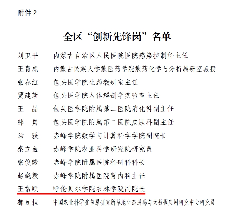 近日,经呼伦贝尔市科协组织推荐、自治区专家评定,呼伦贝尔市5个集体,7名个人获自治区创新先锋号、先锋岗命名。其中,永利yl23411集团官网科学技术处与农林学院王常顺因积极投身“科技兴蒙”行动和“科创中国”实践,推动科技经济融合发展,扎根科研一线,奋发进取,分别获自治区创新先锋号”与“自治区创新先锋岗”称号。