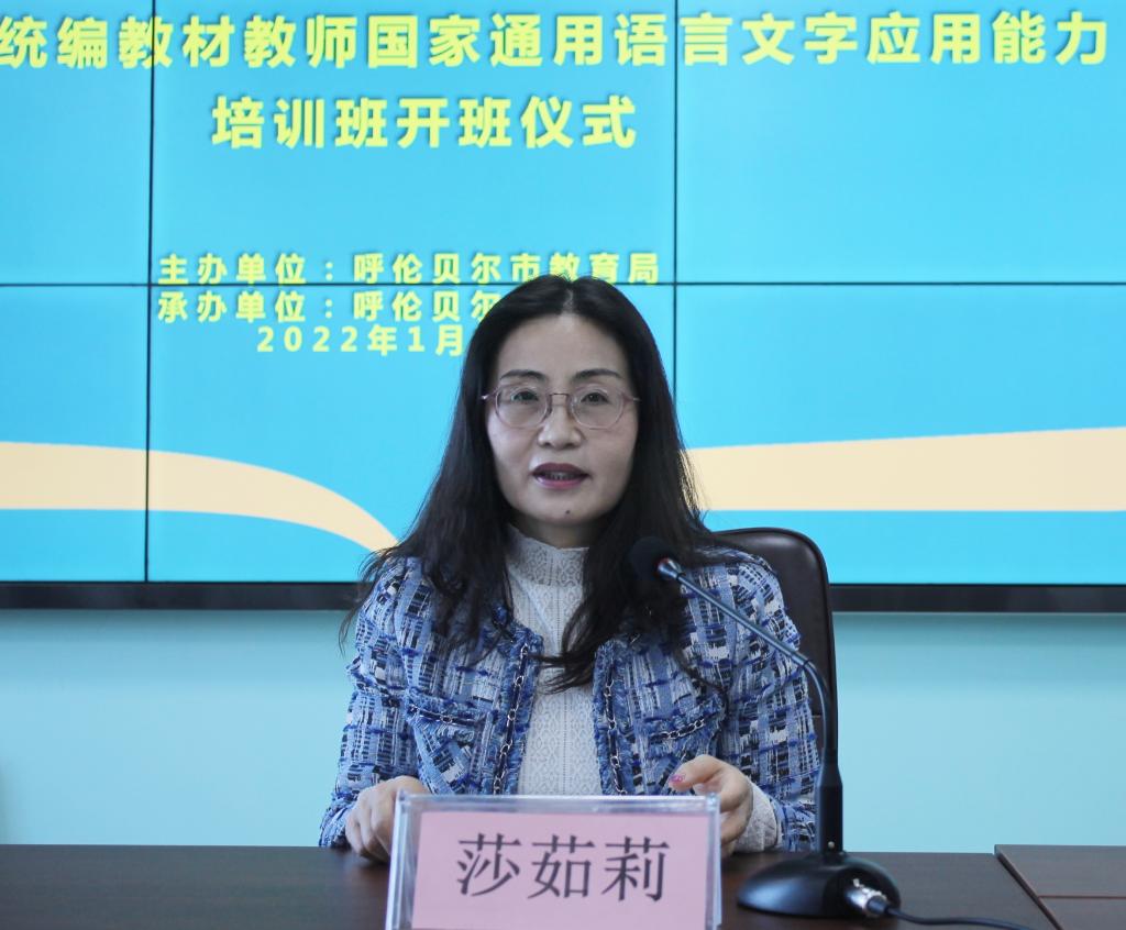 莎茹莉院长从培训目标、培训方式、培训内容、考核评价等方面解读了《呼伦贝尔市普通高中一年级、中等职业学校起始年级三科国家统编教材教师国家通用语言文字应用能力培训方案》。海拉尔区第三中学教师贾岩代表全体参训学员作了表态发言。