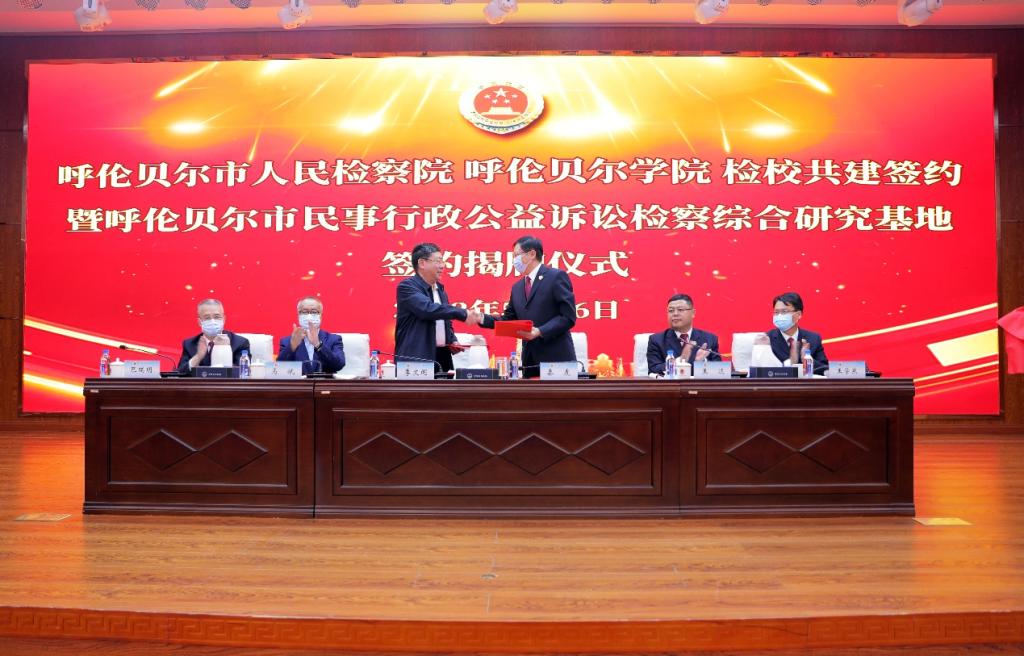 会上,李文阁校长和秦虎检察长共同签署了《检校共建协议书》《呼伦贝尔市民事行政公益诉讼检察综合研究基地合作协议书》,并为呼伦贝尔市民事行政公益诉讼检察综合研究基地揭牌。