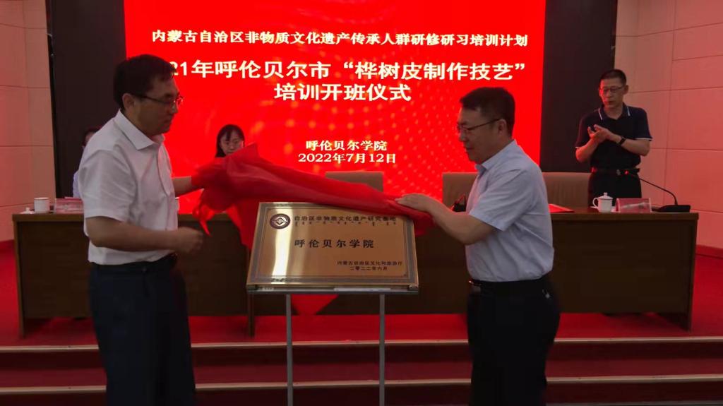 仪式上,孟祥宏副校长对参加开班仪式的各位领导、各位学员表示了热烈欢迎,强调了本次培训的要求。他表示,此次培训将培养学员传统工艺理念、提高设计制作水平、提升传承能力和可持续发展能力。教育学院院长王毅宣读了内蒙古自治区文化和旅游厅内文旅办对教育学院入选“传统美术、传统技艺类非物质文化遗产研究基地”的文件。孟祥宏副校长和张本磊副局长为呼伦贝尔学院“自治区非物质文化遗产研究基地”揭牌。