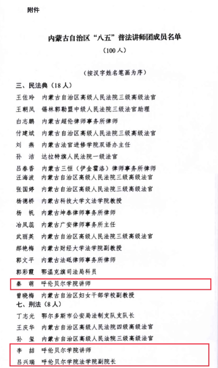 近日,内蒙古自治区委员会宣传部、内蒙古自治区司法厅下发关于成立内蒙古自治区“八五”普法讲师团的通知,永利yl23411集团官网法学院副院长吕兴瑞、讲师秦萌、讲师李喆成功入选。