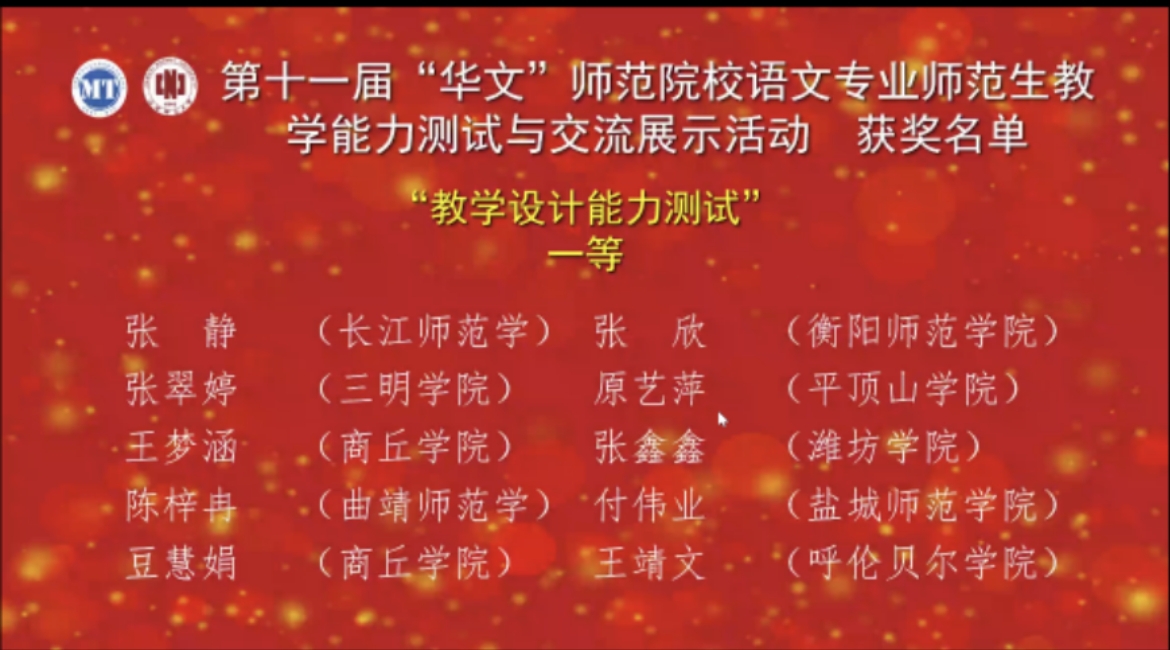 永利yl23411集团官网文学院经校内预选推选汉语言文学专业2019级李丛、2020级王靖文、范紫璐、周彤四名选手参加比赛,经过异彩纷呈的测试与交流展示,李丛获得教学片段设计能力一等奖,范紫璐、周彤、王靖文获得教学片段设计能力三等奖;李丛获得教学能力测试二等奖,范紫璐、周彤获得教学能力测试三等奖,王靖文获得教学能力测试优秀奖。
