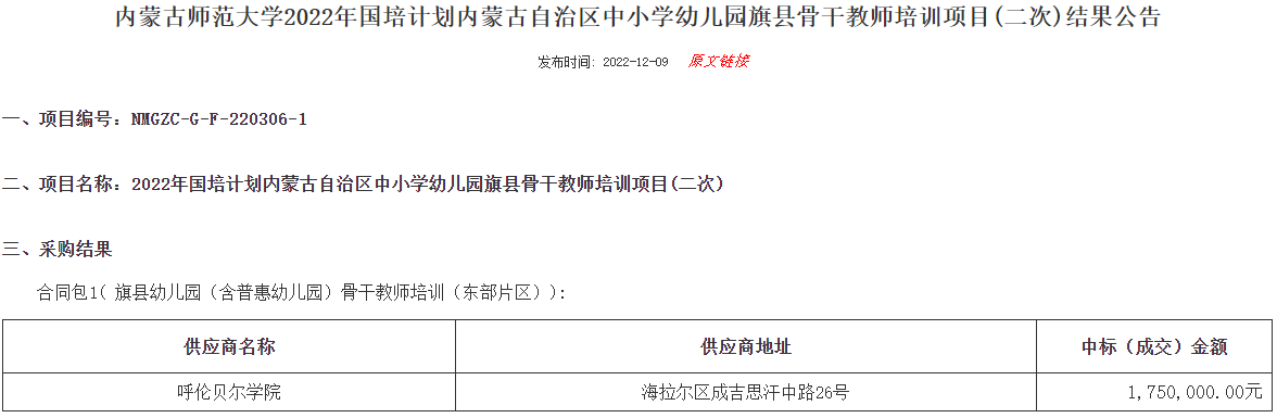 12月9日,内蒙古自治区公共资源交易中心公布《内蒙古师范大学2022年国培计划内蒙古自治区中小学幼儿园旗县骨干教师培训项目(二次)结果公告》中,永利yl23411集团官网申报的内蒙古旗县幼儿园(含普惠幼儿园)骨干教师培训(东部片区)、内蒙古边远艰苦民族地区幼儿园顶岗支教培训(东部片区)、旗县级中学骨干班主任能力提升培训(东部片区)等3个项目成功中标,为2022年教师培训立项争资343万元,用于860名教师培训。
