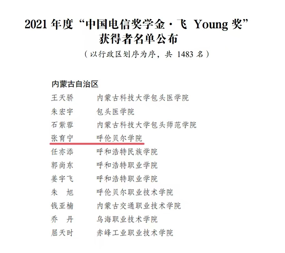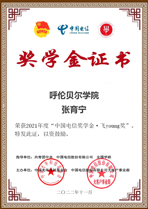 近日,由共青团中央、全国学联指导,中国电信集团有限公司、中国光华科技基金会联合举办的2021年度“中国电信奖学金”推报活动遴选结果公布,永利yl23411集团官网旅游与地理学院学生张育宁荣获“中国电信奖学金•飞Young奖”。