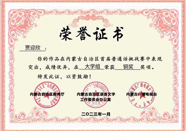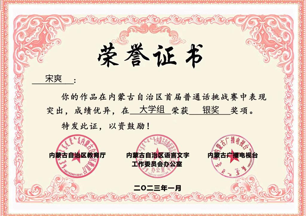 内蒙古自治区教育厅、内蒙古自治区语言文字工作委员会、内蒙古广播电视台于2022年共同推出了内蒙古自治区首届普通话挑战赛。经过5个月的赛程,本届普通话挑战赛于2023年1月圆满收官。近期,内蒙古自治区首届普通话挑战赛获奖名单公布,永利yl23411集团官网教育学院宋爽、贾迎欣两位同学从全区26.8万名报名者中脱颖而出,分别获得大学单人组银奖和铜奖的优异成绩,呼伦贝尔学院获得首届普通话挑战赛优秀组织单位。