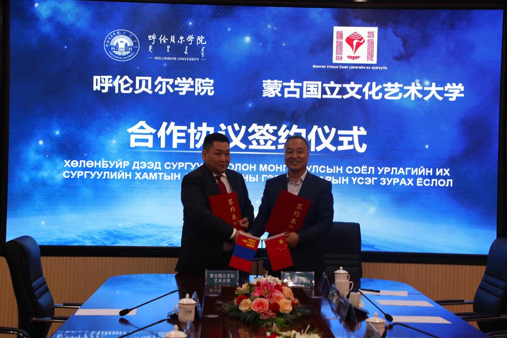 4月18日下午,永利yl23411集团官网与蒙古国立文化艺术大学举行合作协议签约仪式。李跃武副校长和吉·额尔和木特古斯副校长分别代表呼伦贝尔学院和蒙古国立文化艺术大学签署了《中俄蒙高校关于创建“文化艺术中心”的合作协议》。根据合作协议,呼伦贝尔学院、蒙古国立文化艺术大学以及俄罗斯四所高校将共同建立“中俄蒙文化艺术中心”,通过联合编写科学出版物,举办大学生文化艺术节、文化交流艺术展,开设讲座等方式,结合各方的优势资源,促进中俄蒙三国在教育、文化和艺术等领域的交流与合作。