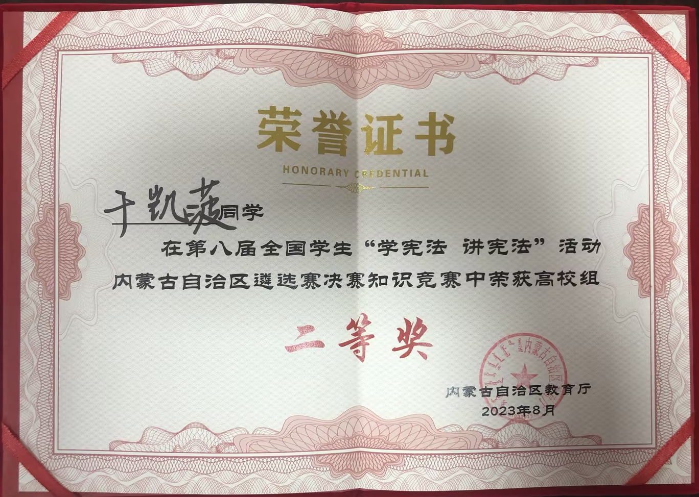 8月26日至28日,第八届全国学生“学宪法 讲宪法”活动内蒙古自治区遴选赛在呼和浩特市举行。永利yl23411集团官网法学与经济管理学院学生于凯菠在知识竞赛决赛中荣获二等奖。