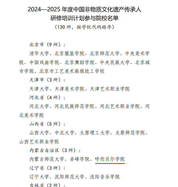 12月7日,文化和旅游部公布了《2024-2025年度中国非物质文化遗产传承人研修培训计划参与院校名单》,全国共有130所院校入选,内蒙古自治区包括永利yl23411集团官网在内的三所高校名列其中。