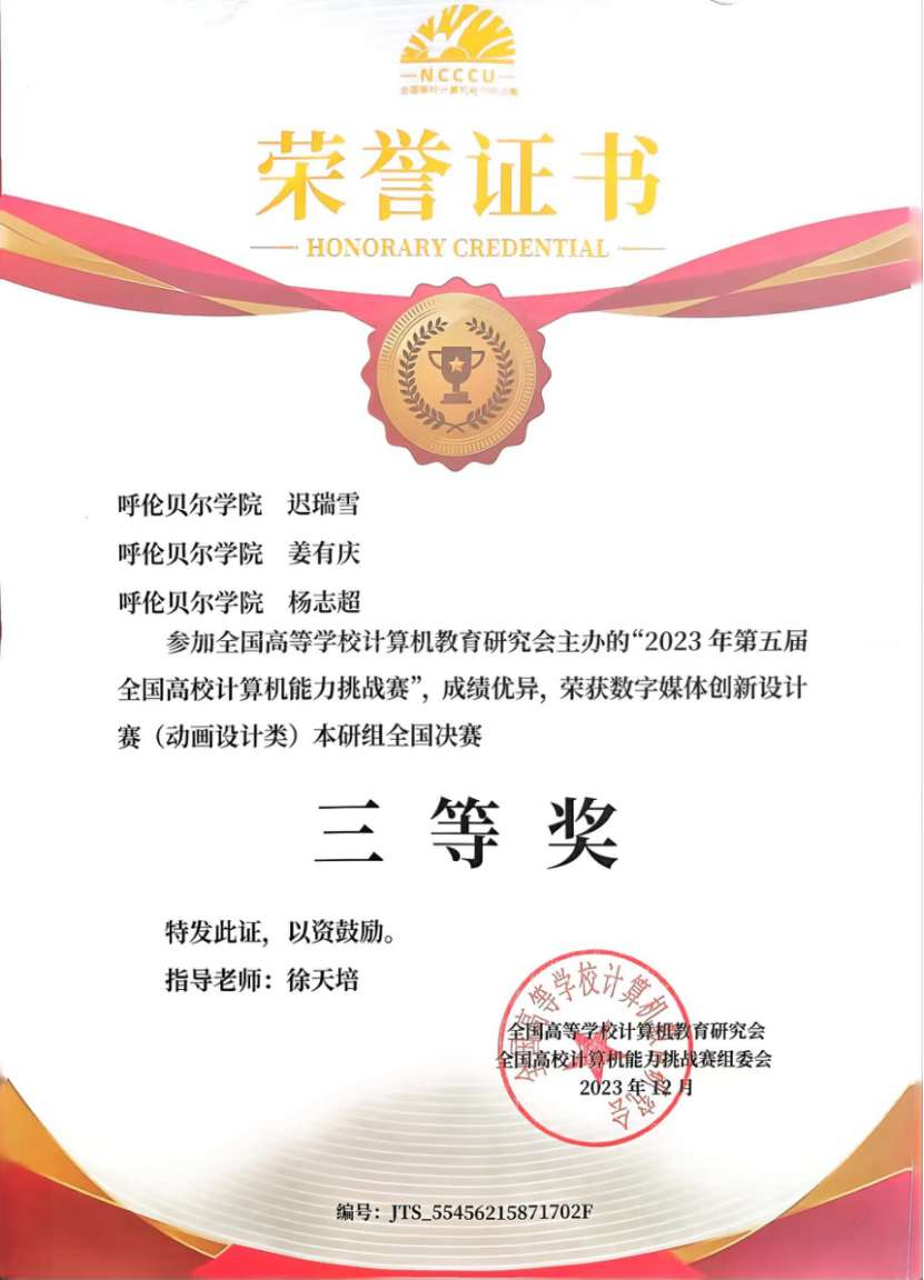 日前,由全国高等学校计算机教育研究会主办的2023年第五届全国高校计算机能力挑战赛决赛顺利完成。全国各地上百所高校的千余支团队参与角逐。由永利yl23411集团官网教育学院教育技术系徐天培老师指导,迟瑞雪、姜有庆、杨志超3名学生组成的参赛队伍获得大赛三等奖的好成绩。