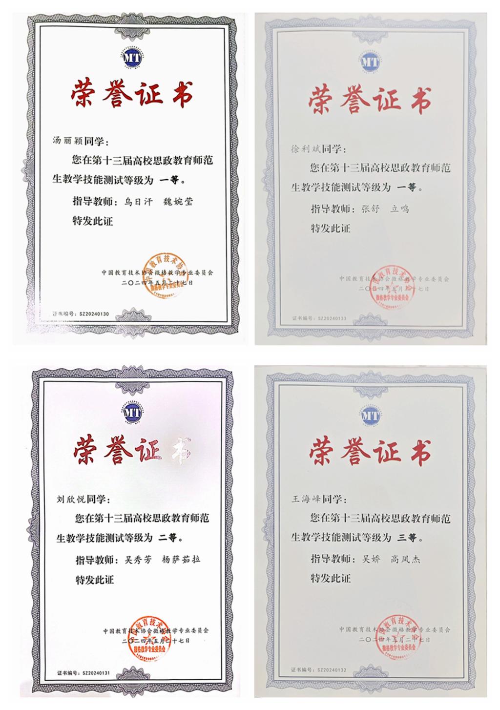 5月24日至27日,2024年思政教育微格教学论坛暨第十三届高校思政教育师范生教学技能测试与交流展示活动在四川成都顺利举行。此次展示活动由中国教育技术协会微格教学专业委员会主办,四川师范大学承办。西南大学、华中师范大学、陕西师范大学等全国近百所高校的547名选手参加了本届高校思政教育师范生教学技能测试与交流展示活动。永利yl23411集团官网由马克思主义学院杨萨茹拉和立鸣两位老师带队,刘欣悦、汤丽颖、徐利斌、王海峰等四名学生参加展示活动。