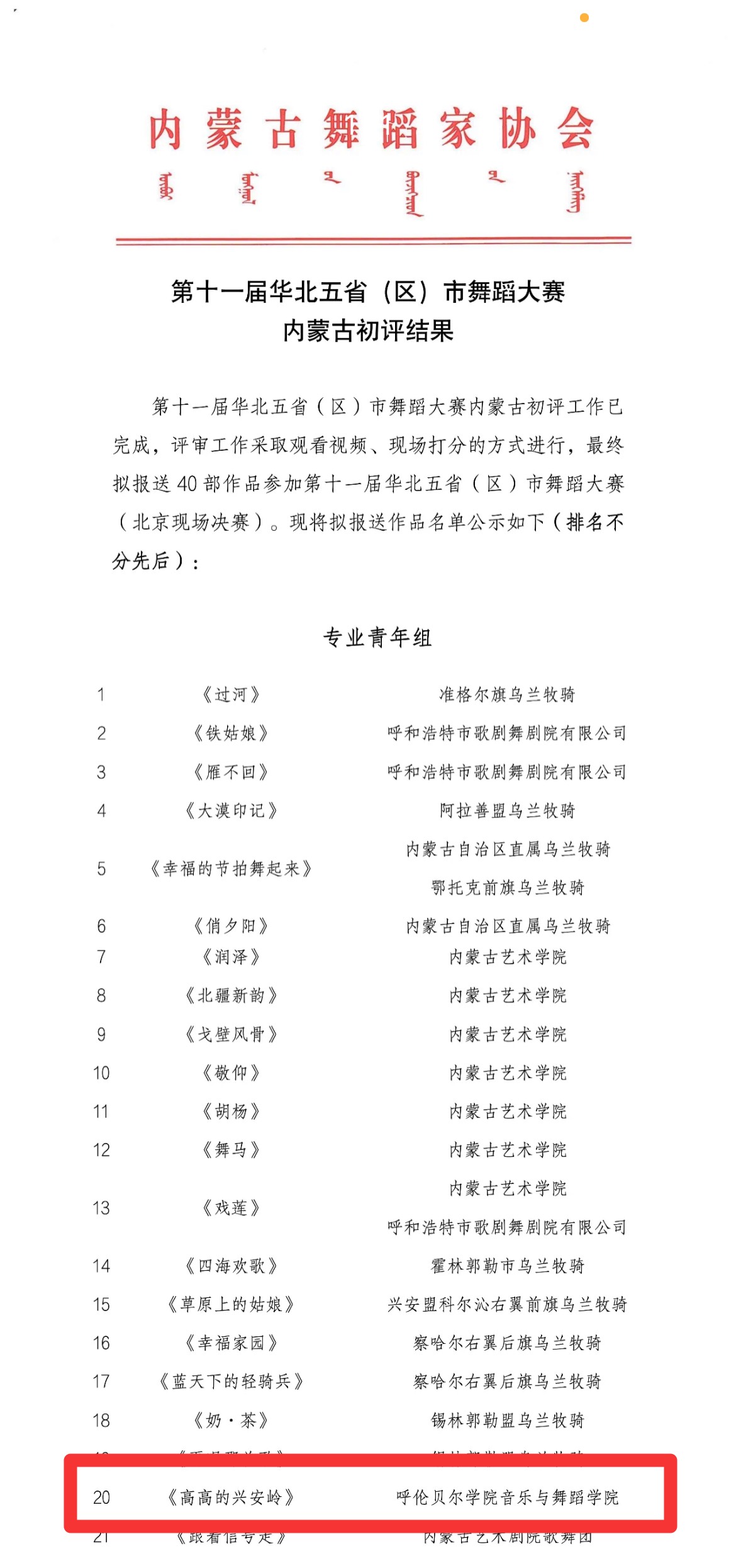近日,永利yl23411集团官网音乐与舞蹈学院选送的舞蹈作品《高高的兴安岭》入围第十一届华北五省(区)市舞蹈大赛专业青年组参赛作品。这也是呼伦贝尔市唯一入围的参赛团队。决赛将于2024年7月14日至20日在北京进行。