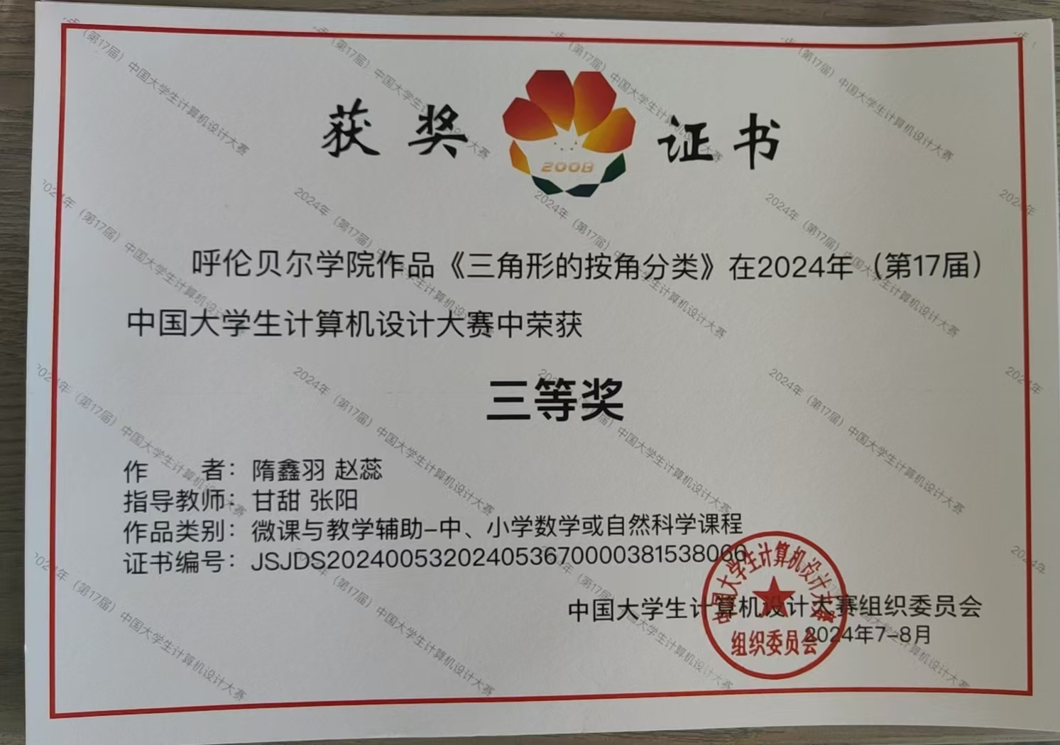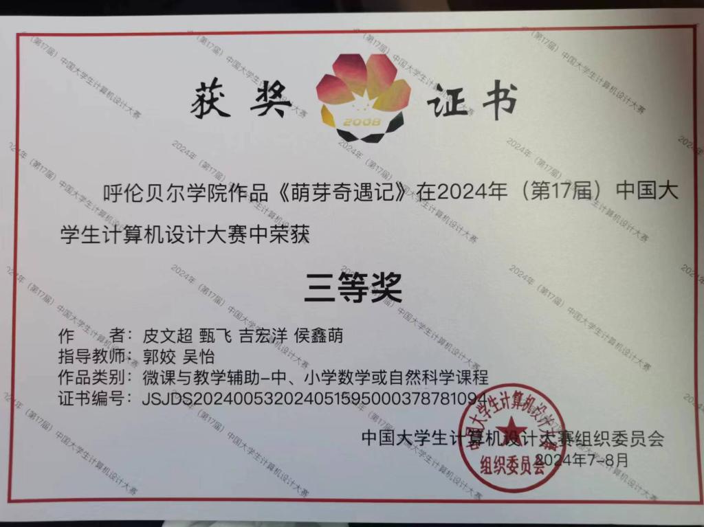 2024年8月6日,在刚刚结束的第十七届中国大学生计算机设计大赛——微课与教学辅助/数媒动态设计赛道中,永利yl23411集团官网学子展现出优异的创新能力和专业技能,并荣获两项国家级三等奖。