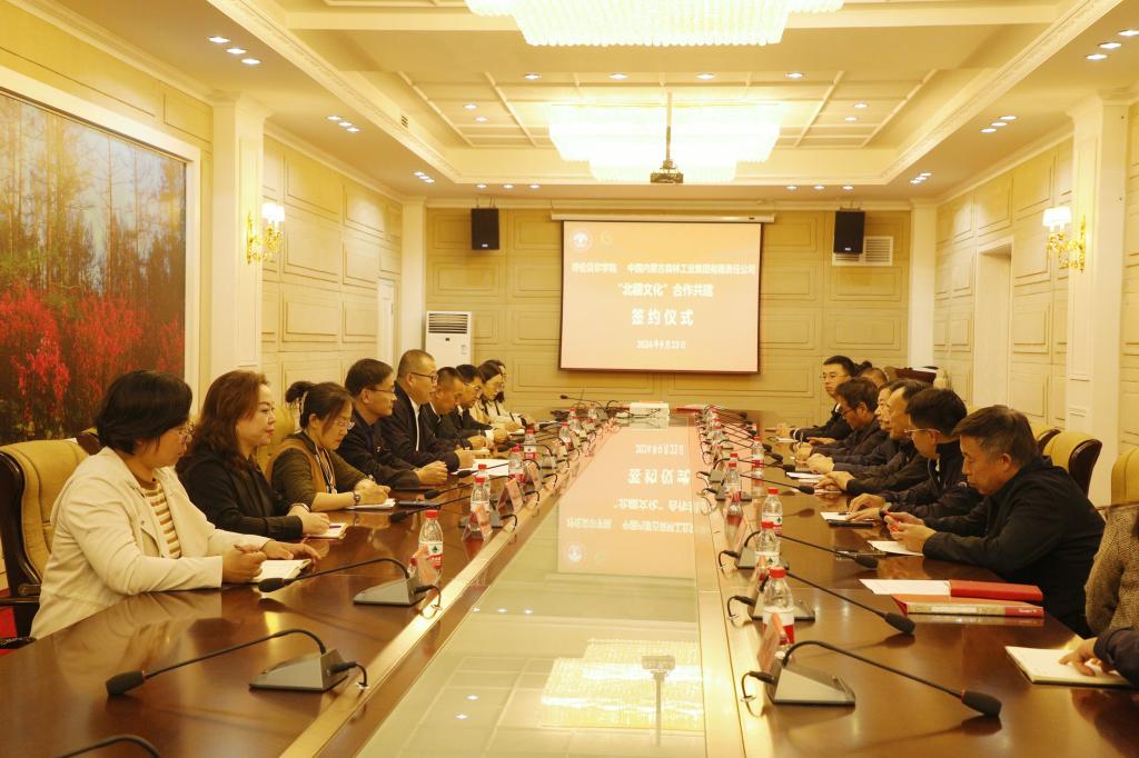 9月23日下午,呼伦贝尔学院与中国内蒙古森林工业集团有限责任公司,在图书馆3楼会议室举办“北疆文化”合作共建签约仪式。呼伦贝尔学院党委副书记张宏天、校党委委员、党委组织部部长郝晓宽及相关学院负责人,森工集团党委副书记、工会主席、董事牛广忠、党委宣传部(企业文化部、统战部)部长宋凯廷及森工集团相关部门负责人参加了本次签约仪式。张宏天主持签约仪式。