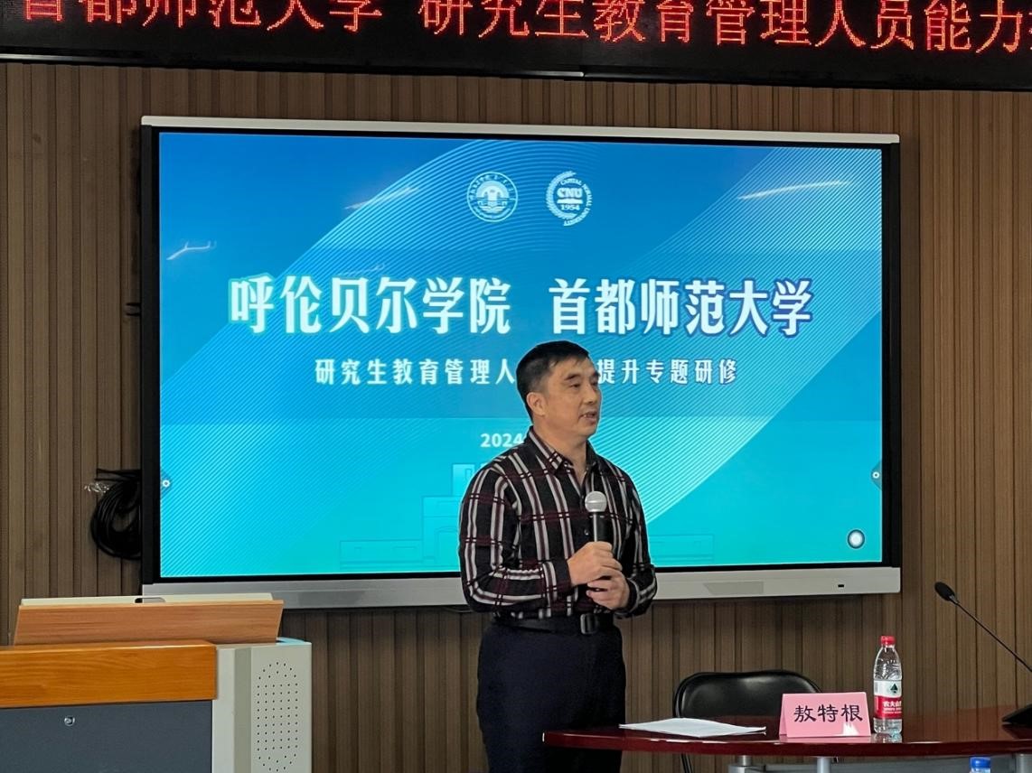 敖特根作开班动员讲话。他向首都师范大学领导和精心组织本次培训工作的研究生院的老师表示衷心感谢,对首都师范大学长期以来对呼伦贝尔学院的关心帮助和指导表示敬意。他指出,本次培训班,主要针对研究生教育管理的关键环节进行培训,帮助各培养单位一线工作人员熟悉和把握研究生教育管理工作的重点、难点以及研究生教育管理改革创新方向,提高学校研究生教育管理人员业务能力,保障学校研究生培养质量,从而提高学校服务研究生教育强国建设的能力。他要求,全体参训人员要充分认识永利yl23411集团官网办好研究生教育的重要意义,认真学习借鉴首都师范大学多年研究生教育管理经验,结合工作实际运用,切实把培训成果转化为具体举措和工作实践,推动学校研究生教育管理工作取得新成效。