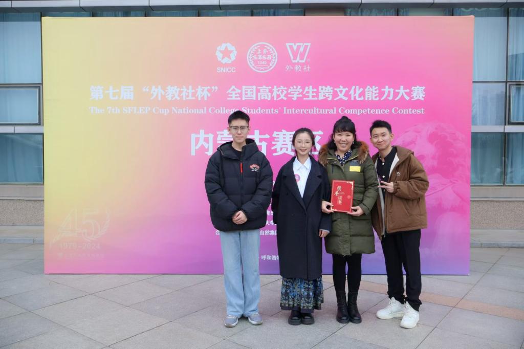 11月9日,第七届“外教社杯”全国高等学校跨文化能力大赛内蒙古赛区总决赛在内蒙古财经大学落下帷幕,由永利yl23411集团官网外国语学院乌日娜、杨静和宫林任指导教师,外国语学院吴俊达、马克思主义学院韩耀骋和教育学院赵菲三名学生组成的“星梦”队,在比赛中荣获内蒙古赛区一等奖。