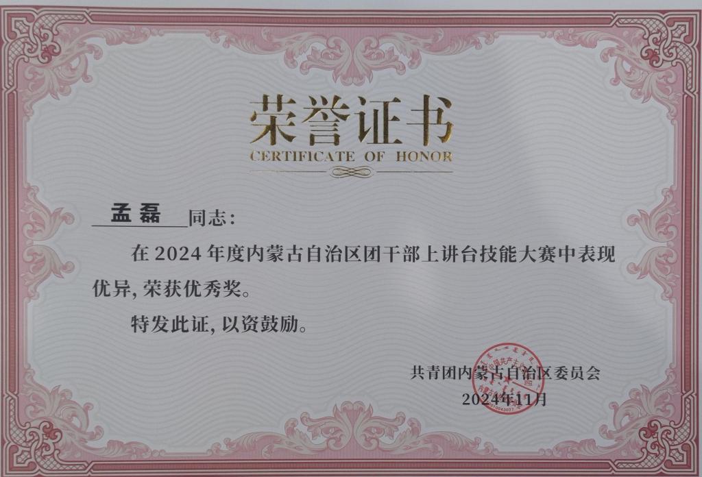 11月16日,由内蒙古自治区团委主办的2024年全区团干部上讲台技能大赛在呼和浩特圆满落幕,来自各盟市团委,直属高校团委、直属企业团委、税务团工委、行业系统团(工、指)委的132名团干部同台比拼,永利yl23411集团官网文学院团学办公室副主任孟磊喜获优秀奖。