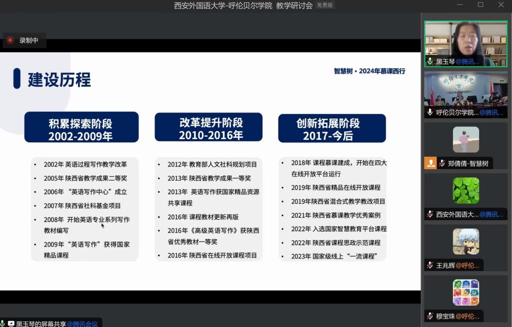 在教学分享环节,西安外国语大学的黑玉琴教授为与会者带来了一场关于国家级慕课建设的精彩讲座。她详细介绍了慕课建设的背景、意义及实施步骤,并分享了西安外国语大学在慕课建设方面的成功经验和优秀案例。黑玉琴教授还就混合式课程的建设进行了深入探讨,提出了在线课程与线下课程有机结合的新思路和新方法。