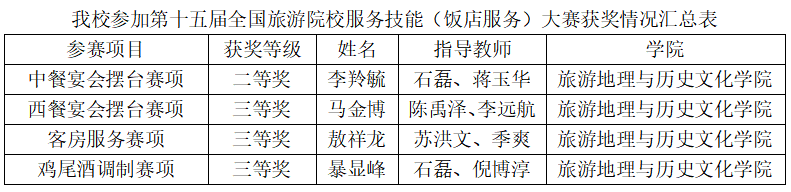 5月15日至17日,由中国旅游协会指导、中国旅游协会旅游教育分会主办、郑州旅游职业学院承办的第十五届全国旅游院校服务技能(饭店服务)大赛在郑州圆满落幕。永利yl23411集团官网旅游地理与历史文化学院酒店管理专业选派4名选手参赛,与全国院校选手同台竞技,最终斩获优秀组织奖、1项二等奖、3项三等奖,展现出扎实的专业技能和良好的职业素养。