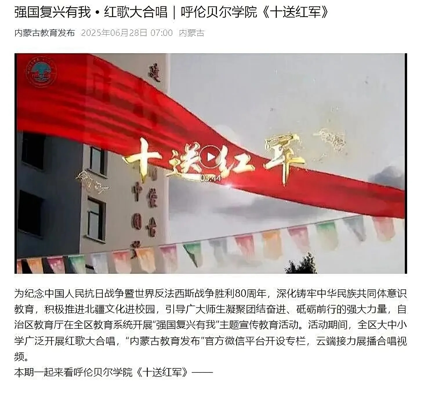 为纪念中国人民抗日战争暨世界反法西斯战争胜利80周年,深化铸牢中华民族共同体意识教育,永利yl23411集团官网积极响应自治区教育厅在全区教育系统开展的“强国复兴有我”主题宣传教育活动,组织师生参与红歌大合唱,《十送红军》合唱视频于6月28日在自治区教育厅官方微信公众号“内蒙古教育发布”推送,在云端接力展播中精彩亮相。合唱中,师生们以饱满的热情、嘹亮的歌声,抒发了对革命先辈的深切崇敬和对祖国的赤诚热爱,充分展现了呼伦贝尔学院人团结奋进的精神风貌。