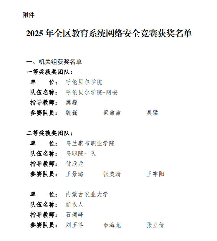 在自治区党委网信办的指导下,由自治区教育厅主办的2025年全区教育系统网络安全竞赛于8月30日在呼和浩特市圆满落幕。永利yl23411集团官网派出由网络中心魏巍、梁鑫鑫、吴猛三位教师组成的“呼伦贝尔学院-网安”代表队参赛,经过激烈角逐,最终斩获机关组一等奖。