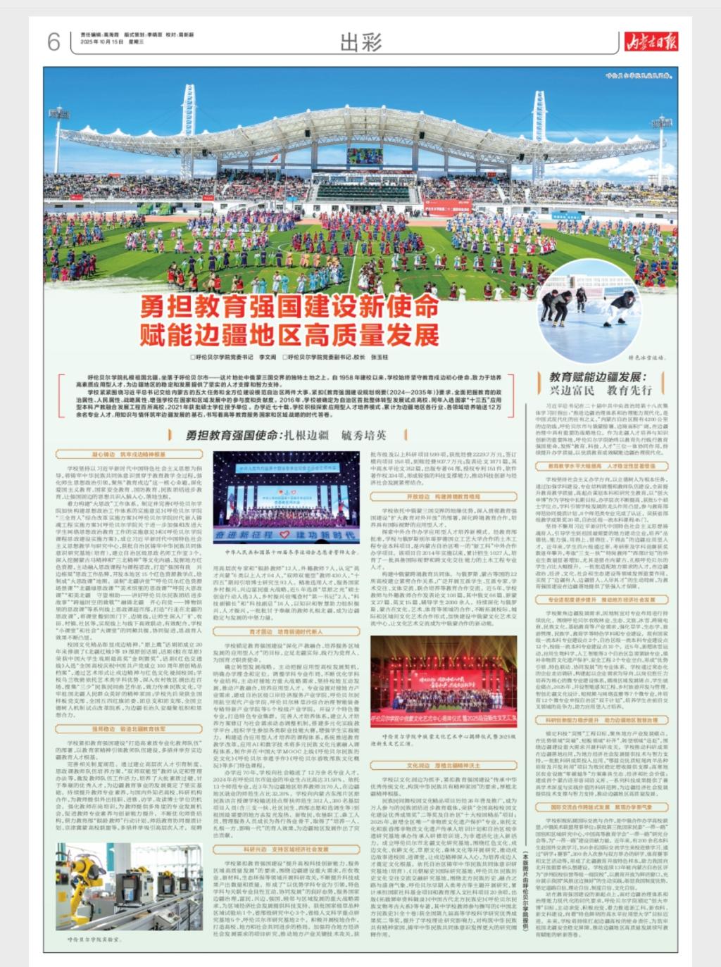 站在教育强国建设的新征程上,面对边疆治理体系和治理能力现代化的时代要求,呼伦贝尔学院锚定“创大申博”目标,主动求变、积极应变,着力推进新工科、新农科、新文科建设,向着“特色鲜明的高水平应用型大学”目标迈进。未来,学校将持续扛起边疆高校的使命责任,为筑牢祖国北疆安全稳定屏障、推动边疆地区高质量发展续写教育赋能的崭新答卷。