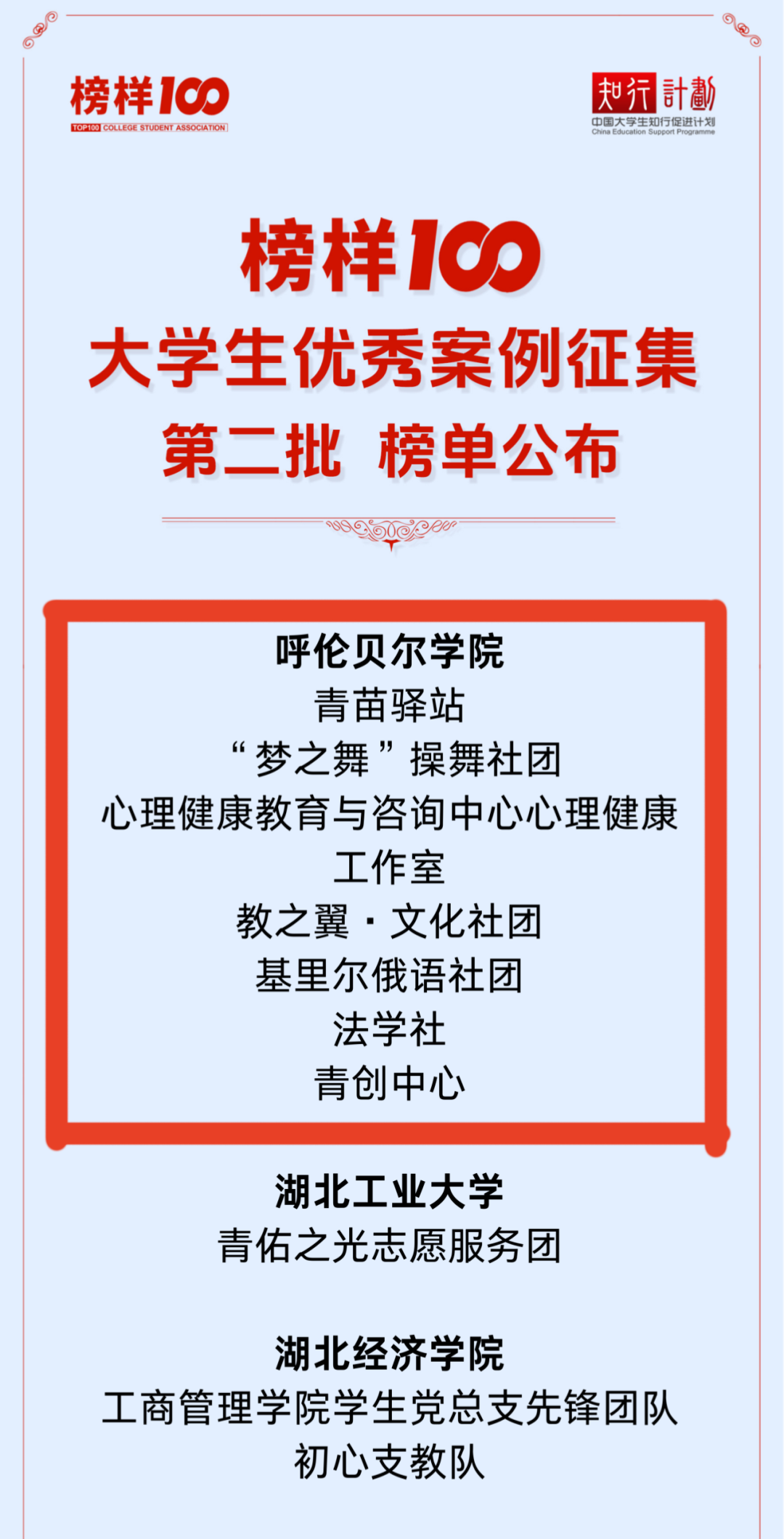 近日,由中国大学生知行促进计划与青年影响力创新中心联合发起的2025年度“榜样100”全国优秀大学生社团及团队征集活动榜单正式揭晓。永利yl23411集团官网青苗驿站、“梦之舞”操舞社团、心理健康教育与咨询中心心理健康工作室、教之翼·文化社团、基里尔俄语社团、法学社、青创中心等7个学生社团荣登榜单。