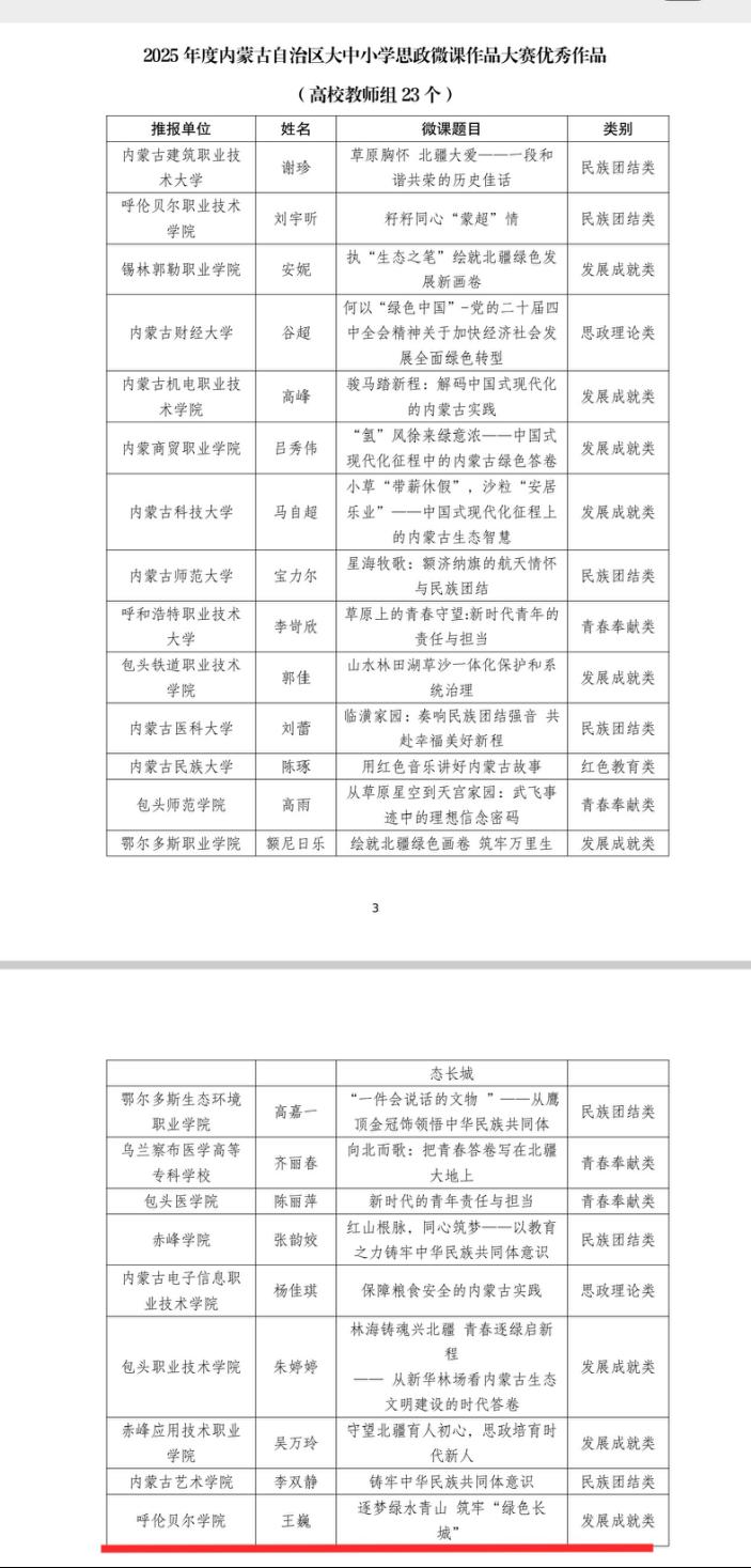 作为全区思政教育领域的重要赛事,本次大赛紧紧围绕铸牢中华民族共同体意识、推进中华民族共同体建设的总体要求,设置民族团结类、思政理论类、发展成就类、青春奉献类等多个类别,既搭建了大中小学思政教育一体化建设的交流桥梁,更推动党、团、队育人链条与“大思政课”深度融合,为强化青年思想政治引领、激活思政教育创新活力注入强劲动能。王巍的获奖作品立足中国式现代化绿色发展鲜明底色,结合内蒙古在统筹山水林田湖草沙一体化保护和系统治理的生动实践,以理论联系实际的方式,生动阐释了内蒙古在筑牢我国北方重要安全屏障中的使命与担当。