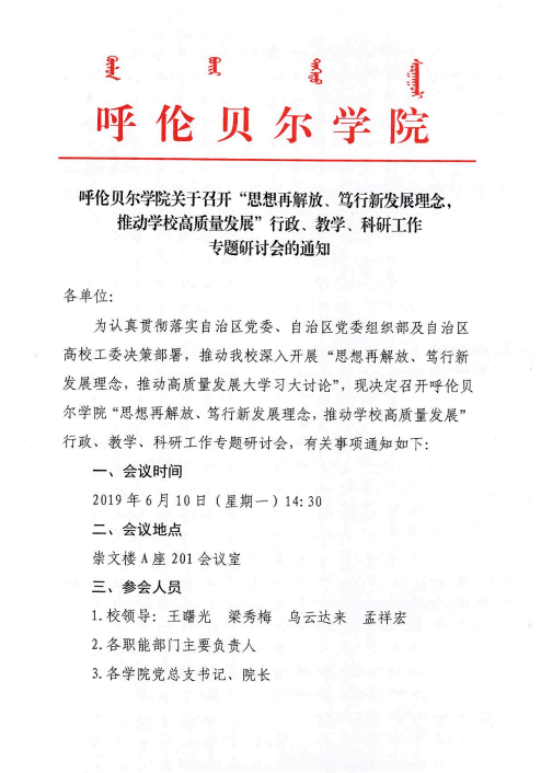 呼伦贝尔学院关于召开“思想再解放、笃行新发展理念,推动学校高质量发展”行政、教学、科研工作专题研讨会的通知