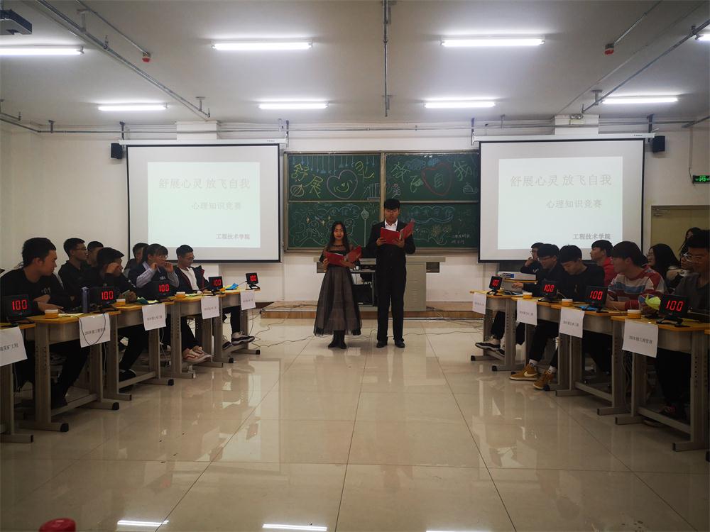 为提升大学生心理健康素养,普及心理健康知识,11月9日下午,工程技术学院在崇文楼B201举办了“舒展心灵,放飞自我”心理知识竞赛。我院两个年级十支代表队共计30人参加了本次知识竞赛。2018级辅导员穆红杰、学生会副主席于鸿麒、侯庆日、文艺部部长张翔宇担任了此次比赛的评委。