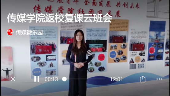 近期,学院结合传媒特色和优势组织开展了一系列活动:为上好学生返校后的第一堂课,学院责成团学办制作了“云”班会微视频,辅导员现身说法为学生讲解返校后的报到、就餐、学习等注意须知;为帮助学生实现从家到校的平稳过渡,学院借助传媒微乐园推出有关疫情防控和心理健康教育的培训视频;为了让返校学生快速适应疫情下的校园生活并弥补未返校学生的遗憾,学院为返校的毕业班学子精心安排了“毕业活动计划”,组织学生用手机视频记录毕业生眼中的校园,策划了“毕业季重走校园路”、“毕业季重温师生情”、“毕业季重拾同窗情”等系列活动。