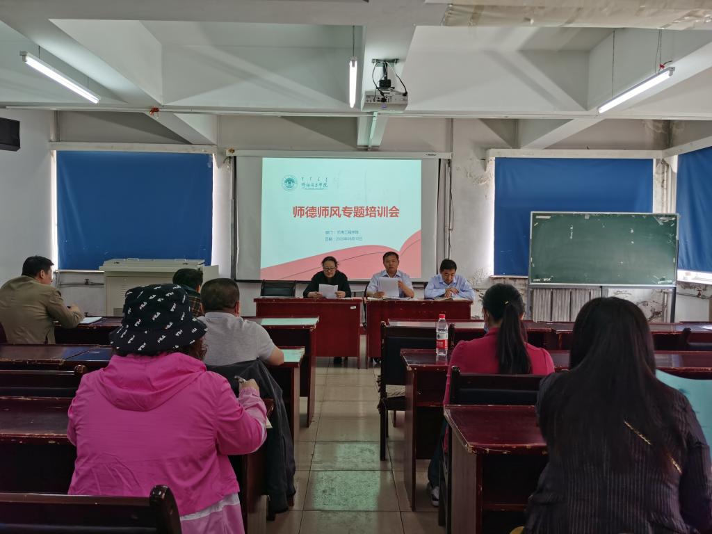 为进一步贯彻落实“立德树人”根本任务,加强师德师风建设,按照学校通知精神,6月10日下午,机电工程学院组织全体教职工召开以“厚植爱国情怀,涵育高尚师德,加强新时代教师队伍建设”为主题的师德师风专题培训会,培训会由党总支书记王旭主持。