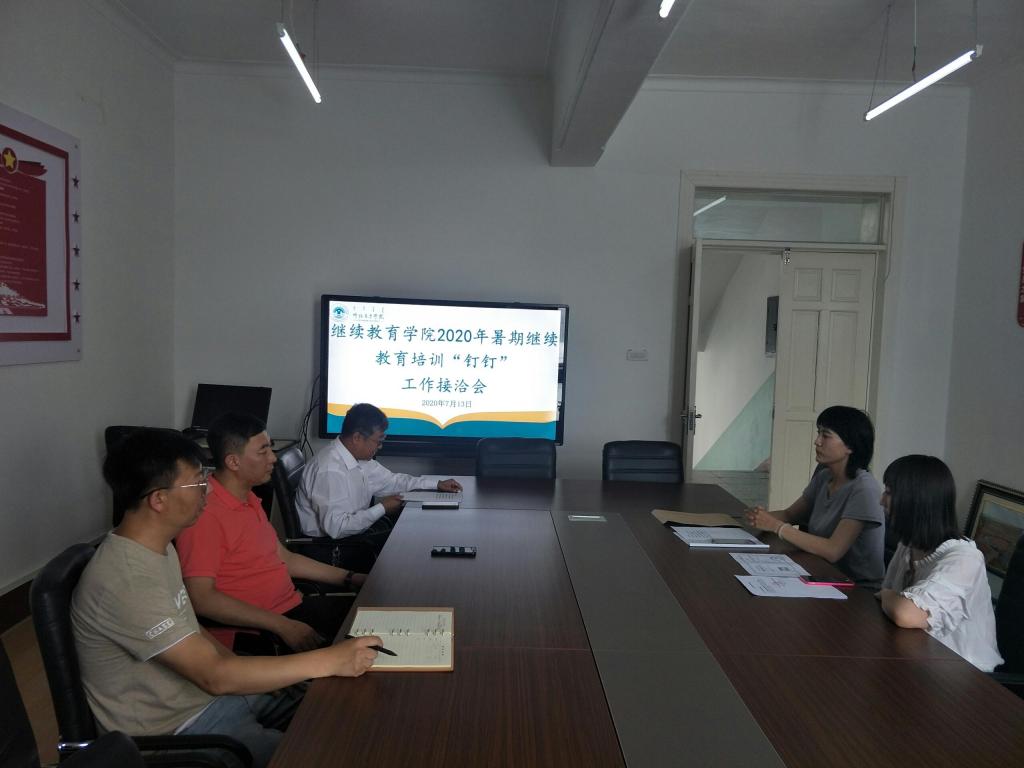 7月13日下午,继续教育学院院举行“2020年暑期中学教师继续教育培训‘钉钉’合作洽谈会”。 2020年暑期中学教师继续教育培训由集中面授改为线上培训,培训具有人员数量大、学科多、班级多等特点,几千人同时授课,是对我院线上教学管理的“重大考验”。为此,我院特与“钉钉”平台区域负责人多次协商,对“组织构架”、“人员上限”、“班级管理”、“人员录入”、“合班授课”、“学院考勤”、“线上评教”等多项事宜达成了协议,并办理了相应手续。培训学员只需下载软件并注册即可进入指定班级,既简化了操作流程,也便于班级学员管理,可实现授课、互动、签到、考测布置等诸多功能。