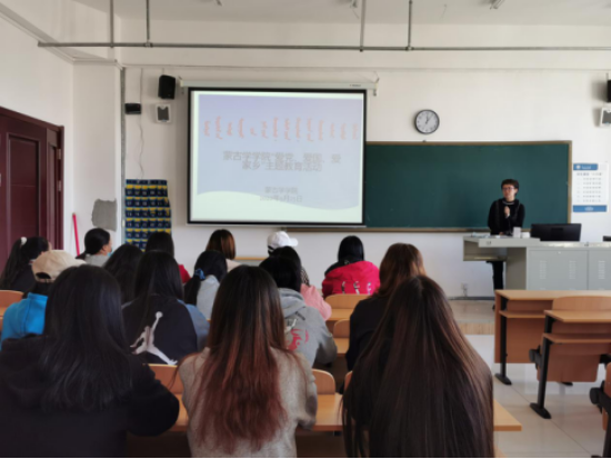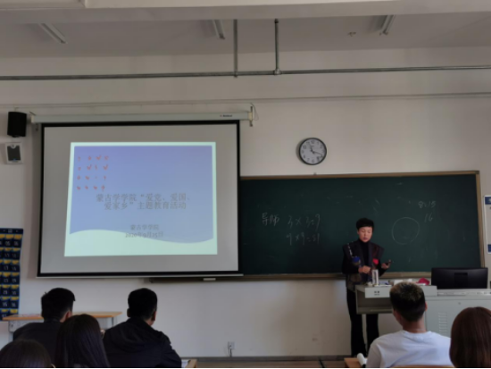 蒙古学学院党总支书记乌云、院长白秀峰、副书记乌云图、副院长雪晴分别在各自联系班级开展“爱党、爱国、爱家乡”主题教育活动。各班以班级团日活动的形式开展“爱党、爱国、爱家乡”主题讨论会。乌云书记在17级语言文学一班和二班讲解中强调,“爱党、爱国、爱家乡”首先,要学习了解党史;其次,我们要深刻体会中国人民在党的领导下从站起来、富起来走向强起来的奋斗历程;再次,我们要胸怀爱国报国之心,加强学习,坚定理想信念,注重实践锻炼,提升能力素质,永远跟党走,报效祖国。白秀峰院长在18级语文教育班和语言文学二班讲解中强调,先学会做人再谈为何而学习。乌云图副书记在19级各班讲解中强调,要努力学习,成为国之栋梁,回报祖国,回报社会,回报父母。雪晴副院长在18级社会学班和秘书班讲解中强调,有党才有国,有国才有家,跟党走、爱国家、爱家乡才是当代大学生精神寄托。