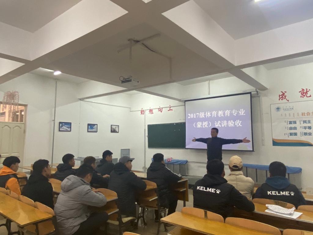 为检验大学生综合素质和教学能力,强化大学生课堂教学技能水平,提升学生的就业能力,体育学院体育教育系于9月23至10月4日,开展了2017级体育教育专业毕业生试讲验收专项工作,2017级体育教育汉本班和体育教育蒙本班全体学生参加了此次验收。在体育教育系主任周庆柱和副主任姜莹两位老师的协同下,同学们严格按照中学体育教学中对体育教师的要求标准讲授教学。