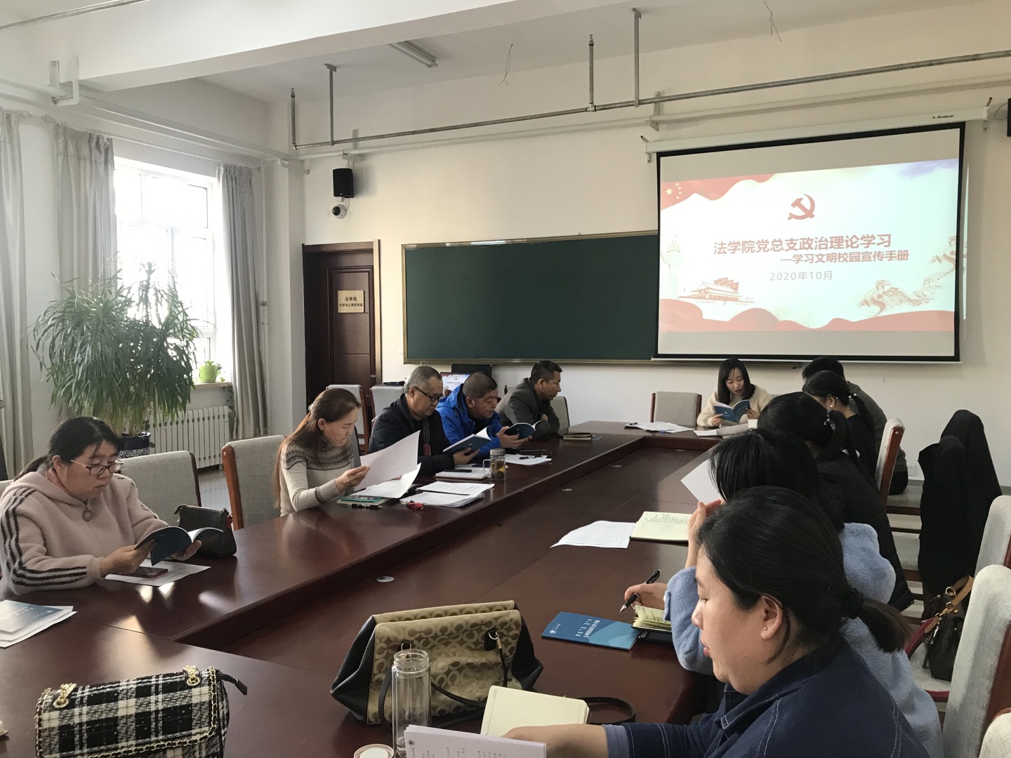 为落实学校文明校园创建工作安排,法学院党总支组织全体师生于10月中旬开启为期一周的《文明校园宣传手册》学习活动。