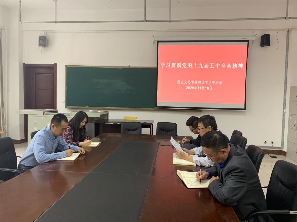11月18日下午,历史文化学院党总支理论学习中心组集体学习十九届五中全会精神,集体学习由党总支书记李雅杰同志主持,理论学习中心组全体成员参加了学习活动。