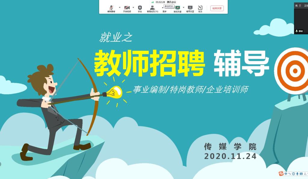 为进一步帮助我院学生熟悉教师招聘考试的内容和流程,提高学生的应试能力和就业能力,传媒于11月24晚组织举行“教师招聘辅导”讲座。本次讲座采用“线上”形式进行,由教育技术学专业系主任张雅娴和专业课教师吴丽莉两位老师主讲,80余名学生在线聆听了此次讲座。